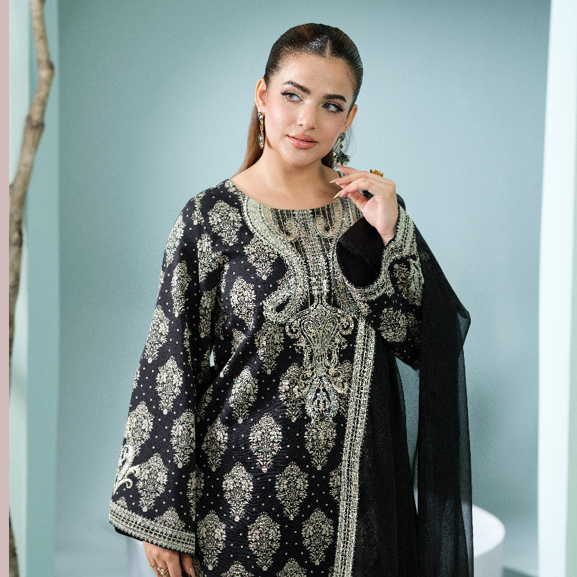 Dupatta: Solid black or matching sheer dupatta (Chiffon/Net).