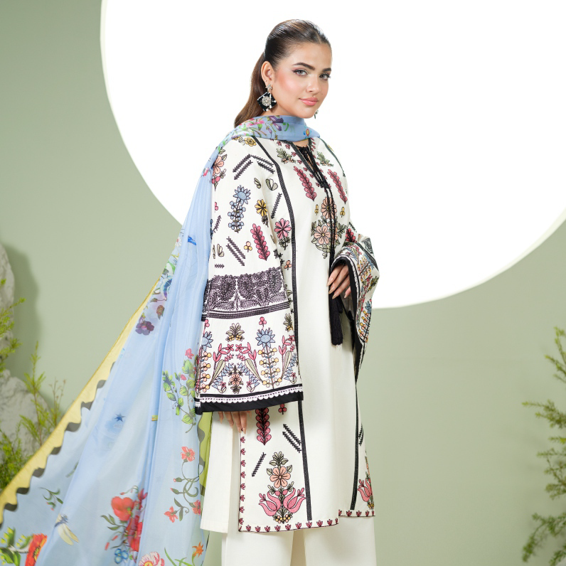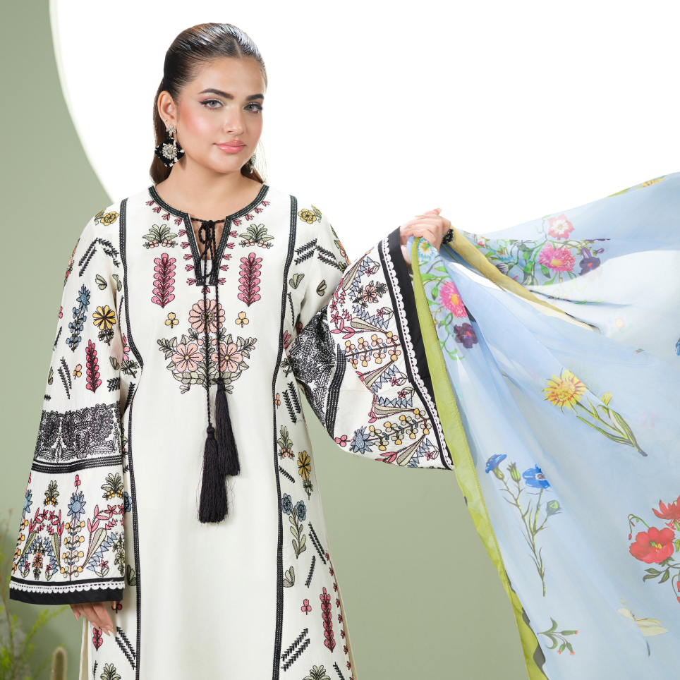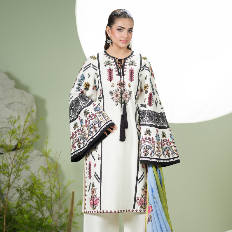 Shirt: Lawn/Cotton straight kurta featuring detailed digital print on the front and flared sleeves with black accents.