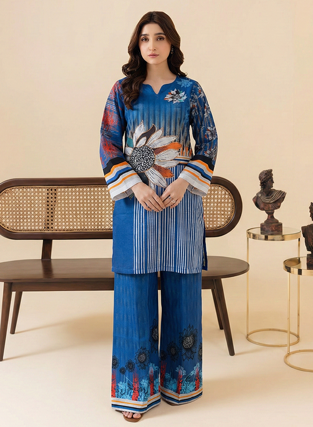 Trousers: Includes matching wide-leg trousers that continue the blue textured print, finished with a dark floral border and striped accents at the hem.