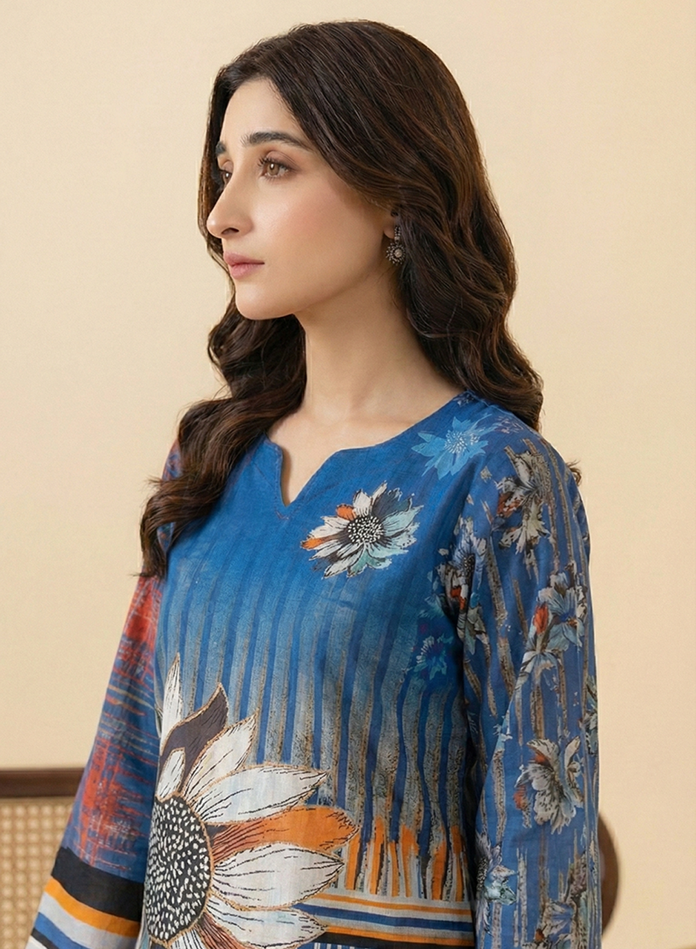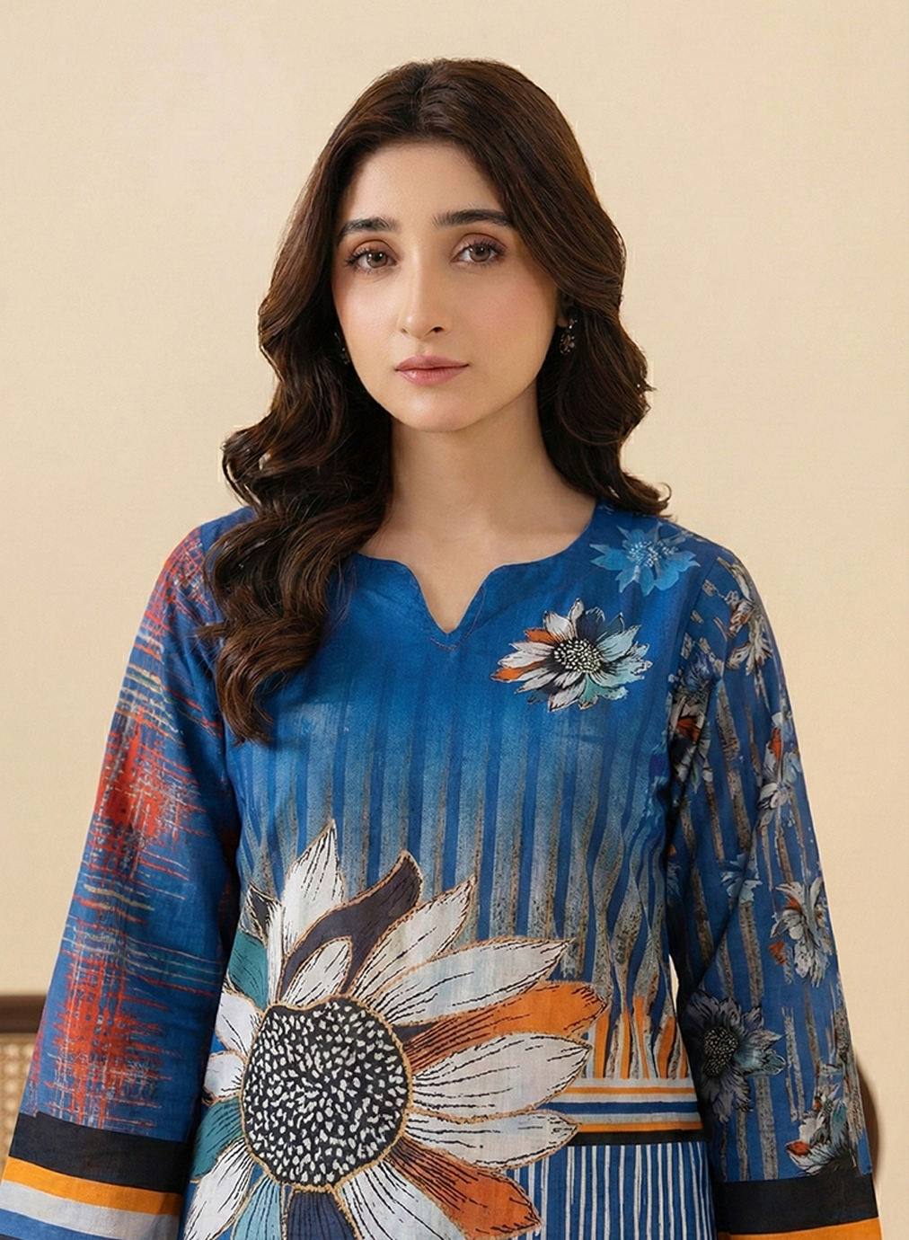 Shirt: A contemporary digital printed shirt with a unique notched neckline and wide-cut sleeves featuring bold horizontal striped borders in orange, black, and white.