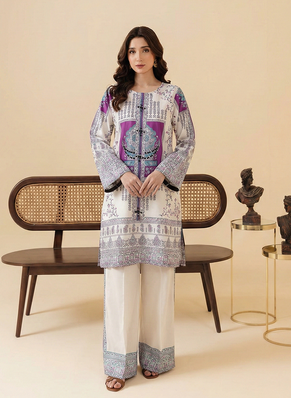 Elevate your daily wardrobe with this sophisticated two-piece ensemble that perfectly blends traditional motifs with modern aesthetics.