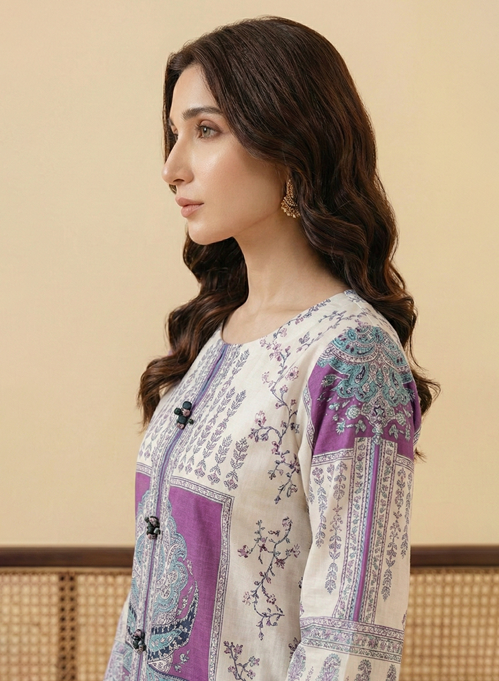 Shirt: A digital printed shirt featuring a narrow band collar with decorative black knotted button detailing and wide-cut sleeves with intricate grey and purple borders.