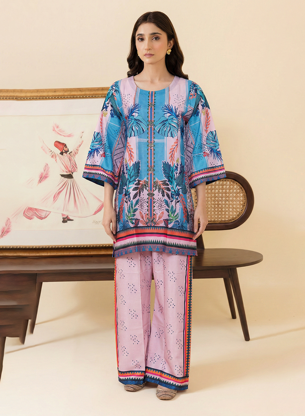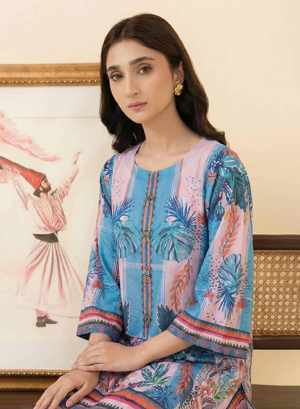 Design: The shirt features a soft lavender base with a striking turquoise central panel, adorned with vibrant tropical leaf illustrations and pink botanical patterns.