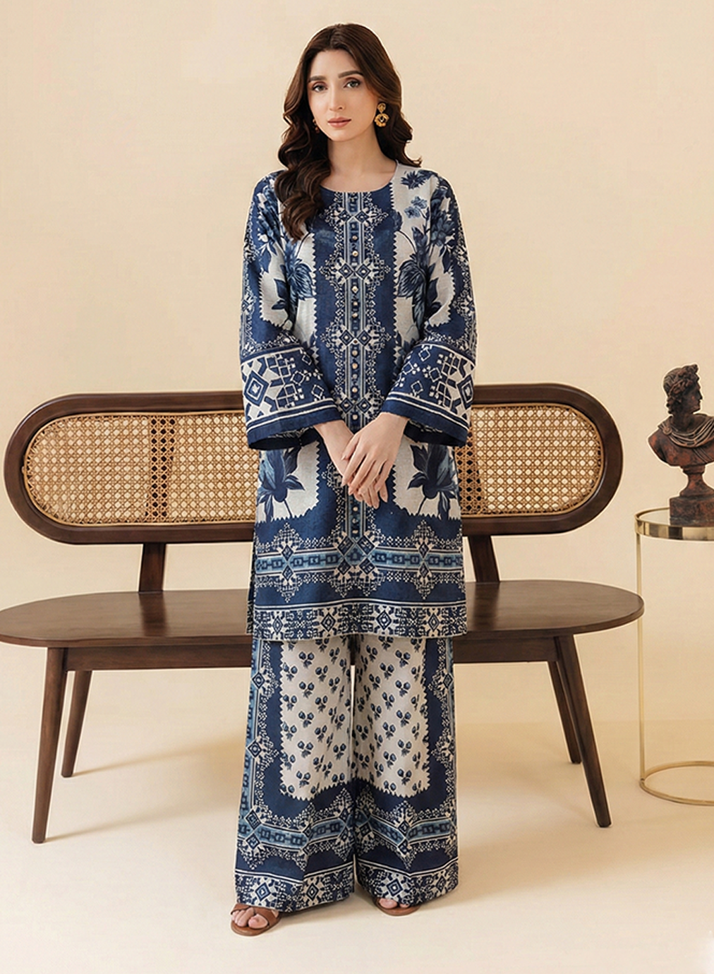 Shirt: A digital printed shirt with wide-cut sleeves and a structured ethnic border, showcasing a symmetrical layout that creates a refined, classic silhouette.