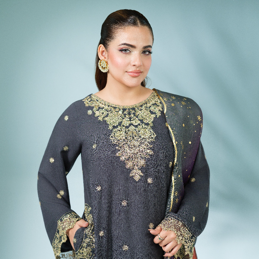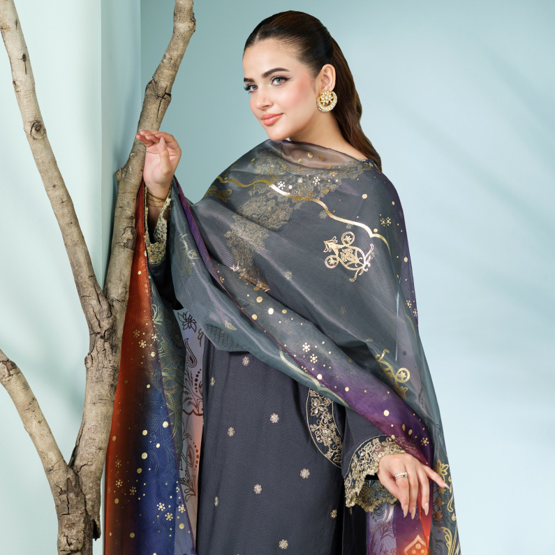 A refined charcoal outfit adorned with intricate gold embroidery for an elegant festive look. The vibrant multi-tone dupatta adds a striking contrast to the graceful ensemble.